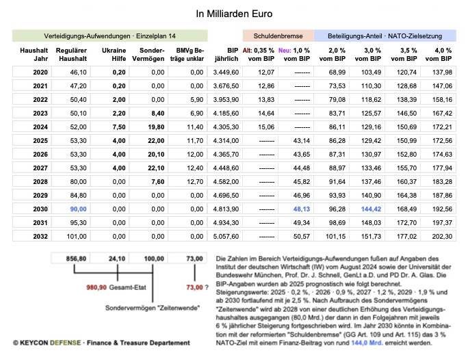 Erst ab 2028, wenn dann der Verteidigungs-Etat im regulären Haushalt auf 80,0 Mrd. € aufgestockt und jährlich mit 6 % Steigerung fortgeschrieben wird, landet man 2030 / 2031 im als zukünftig nötig erachteten 3 % Ziel als NATO-Beitrag vom BIP.